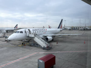 Als onderdeel van een stedentrip naar Bilbao vloog ik met een Embraer E170 van Air France Hop van Parijs naar Bilbao. Vanuit Amsterdam kwam ik met een KLM vlucht aan op Parijs Charles de Gaulle (CDG) airport in Terminal 2F. De vlucht naar Bilbao vertrok vanaf Terminal 2G. In terminal 2G heeft Air France een lounge met een “warme bakker”, ik was er dus niet rouwig om dat ik een bus transfer naar terminal 2G moest maken, ook al kost het de nodige tijd om daar te komen vanuit terminal 2F.