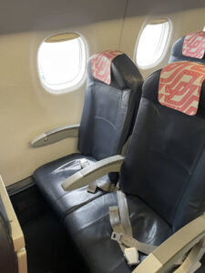 Inderdaad startte boarding een half uurtje later en aangezien het vliegtuig niet aan een slurf stond, konden we naar buiten om via een trap het toestel in te gaan. De Embrear E170 is een vrij klein toestel met aan beide kanten van het gangpad twee stoelen.