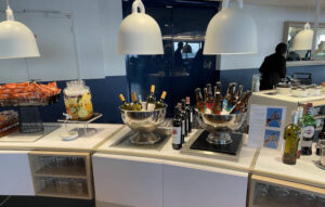 Het was druk in de lounge op de zaterdagochtend, maar een plekje was toch nog te vinden. Ondanks dat de Lounge niet groot is, zijn er douches aanwezig. Als je daar gebruik van wilt maken, meld je je aan bij de balie. Ons doel was meer de Franse Boulangerie, heerlijk versgebakken croissants, eventueel met chocola, madeleines en baguettes lagen op ons te wachten. Aangezien je tijdens de vlucht met KLM naar Parijs alleen een koekje krijgt, hadden we wel trek.