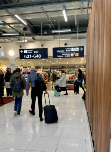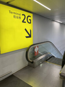 Om van Terminal 2F in Terminal 2G te komen volg je de gele borden, waarop duidelijk de richting naar diverse terminals wordt aangegeven. Wel moet je alert zijn op roltrappen aan de zijkant van hallen en gangen of je niet van etage moet veranderen. Om in terminal 2G te komen is ook een korte busrit nodig. 2G is een terminal, die niet verbonden is met de overige terminals. Het was gelukkig niet druk en de bus stond al klaar, dus waren we van 2F met ongeveer een kwartier in 2G. Op naar Lounge!