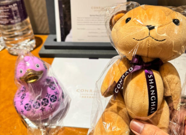 Net zoals je bij KLM in Business Class de Delfts blauwe huisjes kunt sparen, kun je bij Conrad Hotels de pluche mascottes verzamelen – iedere vestiging heeft zijn eigen knuffel. Bij aankomst lag er tot mijn teleurstelling géén knuffel op de kamer, terwijl ik die graag als souvenir had willen meenemen.