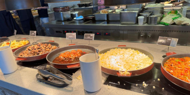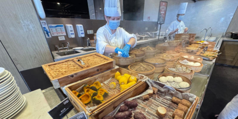 Het buffet is overzichtelijk opgebouwd in eilanden met gerechten uit verschillende wereldkeukens: uiteraard Chinese specialiteiten, maar ook een klassiek Westers ontbijt en zelfs Midden-Oosterse opties. Een ruime keuze dus voor elke smaak.