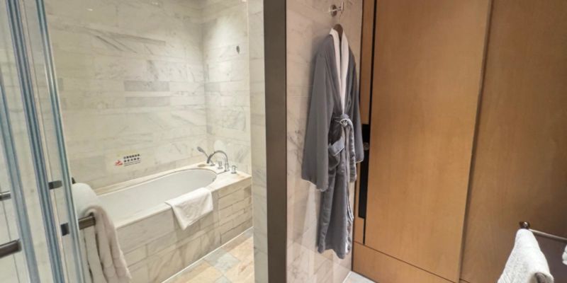Direct links bij binnenkomst van de kamer bevindt zich de ruime badkamer. Hier vind je alles wat je van een luxe cityhotel mag verwachten: een Japans toilet met geïntegreerde douchefunctie, een aparte ruimte met regendouche én ligbad, en een elegante “hal” met de wastafel en alle standaard amenities.