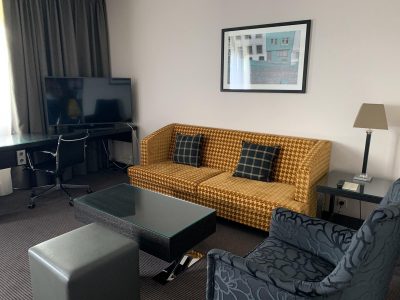 Dankzij mijn Hilton Gold status werd ik geupgrade naar een suite op de een na hoogste verdieping van het hotel. Door de medewerker werd ik voorzichtig geinformeerd dat de suite door het virus vrij kaal was, zo was o.a. de koffiezet machine uit de kamer weggehaald.