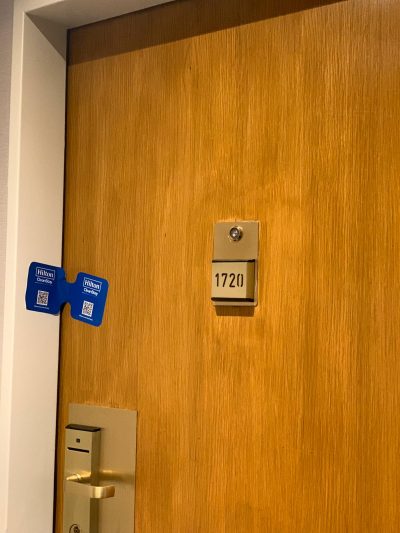 Aangekomen op de 17e verdieping troffen we een seal aan op de deur, even dachten we dat er een misdaad was gepleegd in de kamer. Het bleek te gaan om de Hilton garantie dat de kamer grondig was schoon gemaakt vanwege het virus.