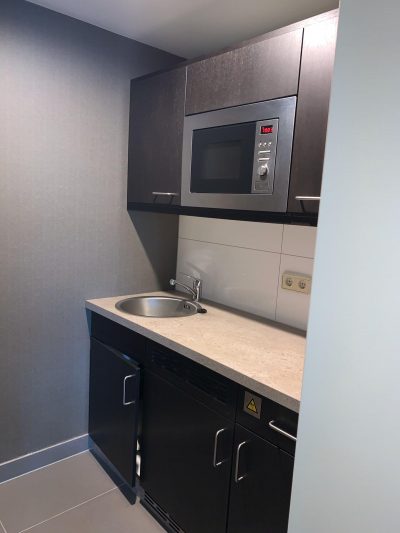 Verder bevatte de kamer een keuken waar je eventueel een maaltijd zou kunnen opwarmen. Naast de ingang van de kamer bevond zich een tweede toiletruimte.