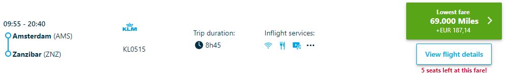 Met 75.000 Flying Blue kun je o.a. een enkele reis in KLM business class boeken naar o.a. Zanzibar.